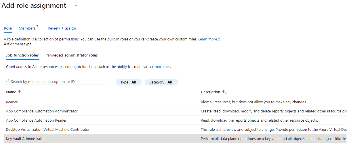 From the IAM option in the Key Vault screen, add a role. For simplicity, we'll use Key Vault Administrator in this example.