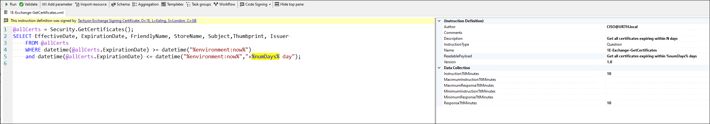 This is quite straightforward to create using the Tachyon Instruction Management Studio (TIMS) and leveraging the platform's powerful built-in functions. In this case, we invoke the Security.GetCertificates() method and then filter to show only certificates which expire within the specified number of days.