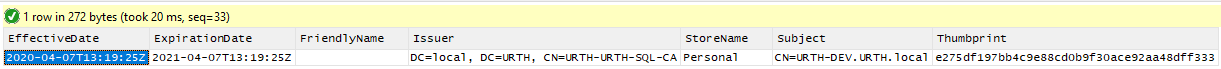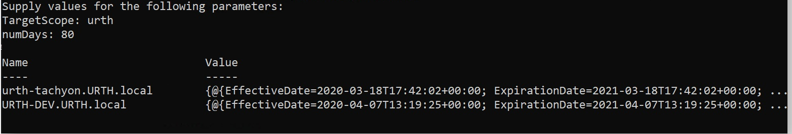 Run in the test lab with a value of 80 days, we see that one certificate is due to expire on April 7, 2021.