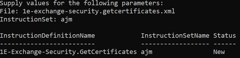 We use the Publish-1EInstruction cmdlet to upload the instruction and assign it to an instruction set. In this example, the set is AJM.