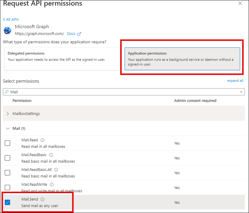 Select Microsoft Graph > Application permission and add Mail.Send.