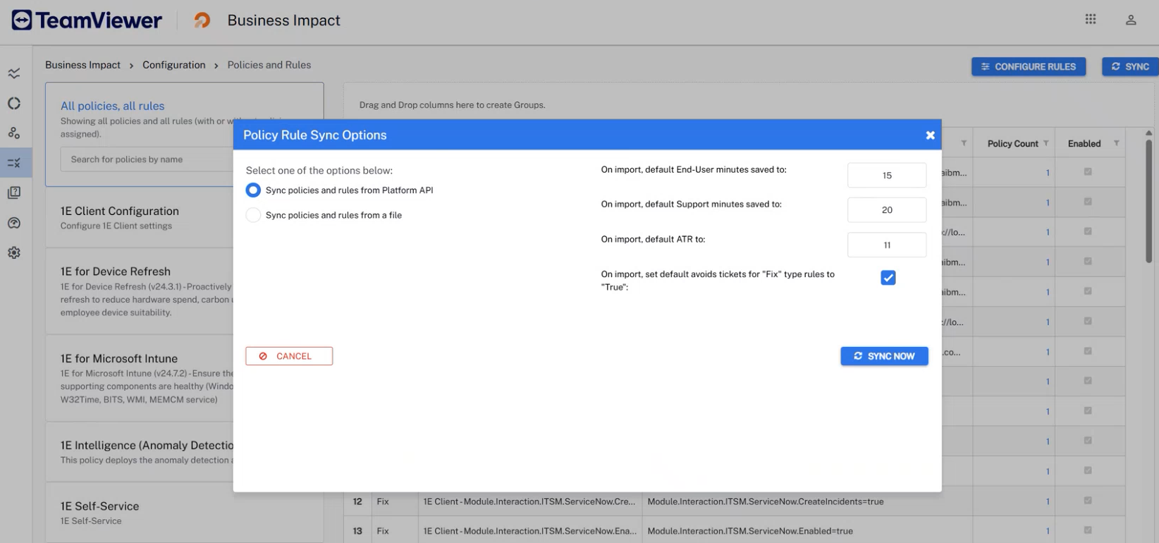You can also go to Business Impact > Configuration > Policies and Rules and click Sync to pull data from the Platform API. If the sync works, you will see your policies here, and within 24 hours your other data will be available.
