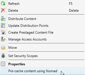 To start the pre-cache wizard, right-click any of the following types of content in the Configuration Manger console and from the context menu, choose Pre-cache content using Nomad.