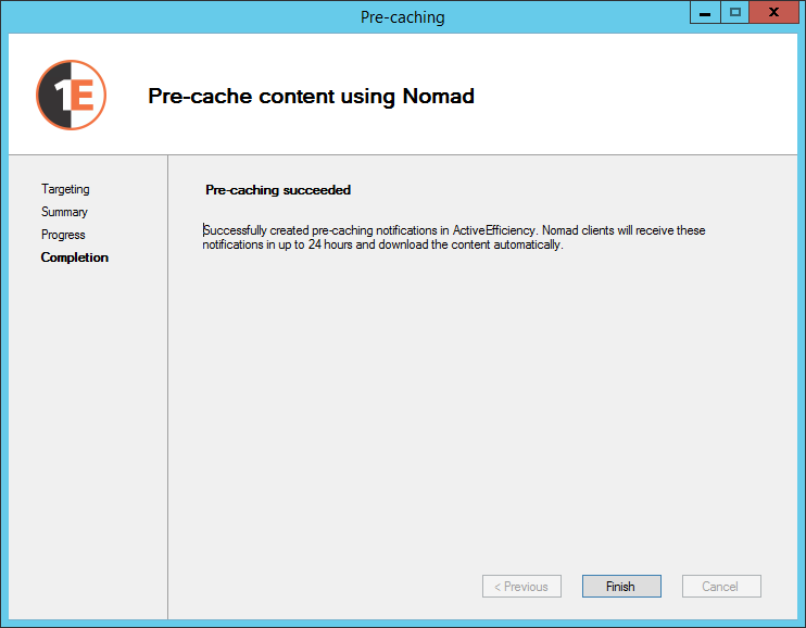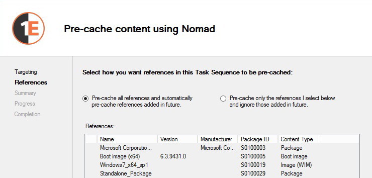 Step 2 The Content Distribution pre-caching wizard stores the target device and package information in 1E Platform. |