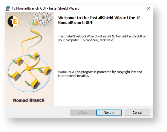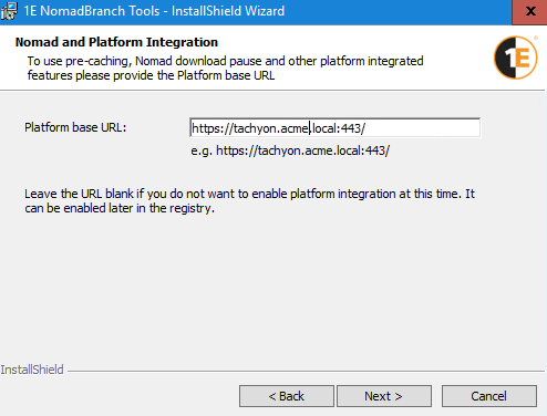 Start a Command Prompt with elevated rights, navigate to the location where you extracted NomadBranchTools.msi and run it with a command-line similar to the following. Where <TCNserver> must be set to the DNS alias FQDN for your 1E Platform. This command-line will also enable the 1E integration to support the Nomad Download Pause feature.