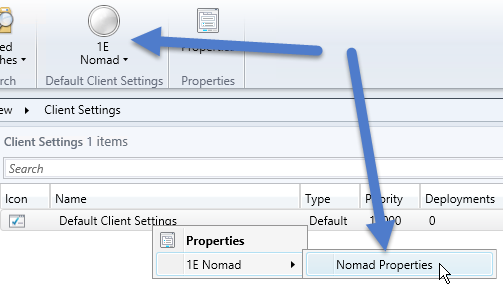 The ribbon has a 1E Nomad button. Click it and choose Nomad Properties (as shown in the image) or, right-click the Default Client Settings and choose 1E Nomad > Nomad Properties.