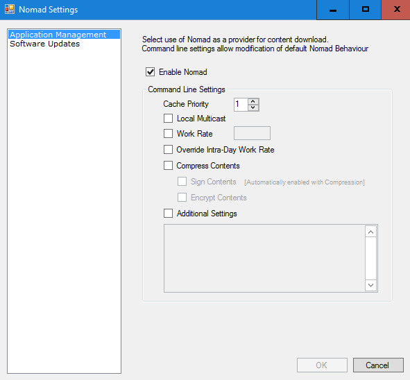 The Nomad Settings dialog allows you to configure settings for Application Management and Software Updates. Click Cancel to close the dialog without making any changes.