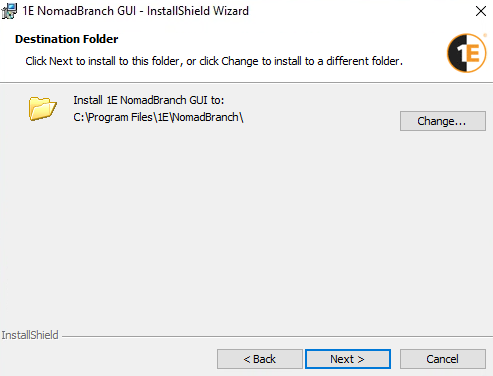 On the Destination Folder screen, click Next to accept the default location (C:\Program Files\1E\NomadBranch\ or C:\Program Files\1E\NomadBranch (x86)\) or Change... to select a new location.
