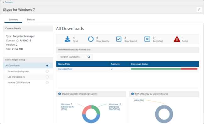 Using the Download Status by Nomad Site tile you can see in which locations (Content Distribution Single Site Download (SSD) sites) the content title has been downloaded and is available.