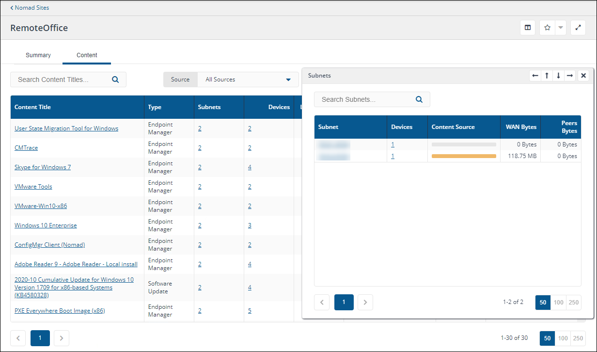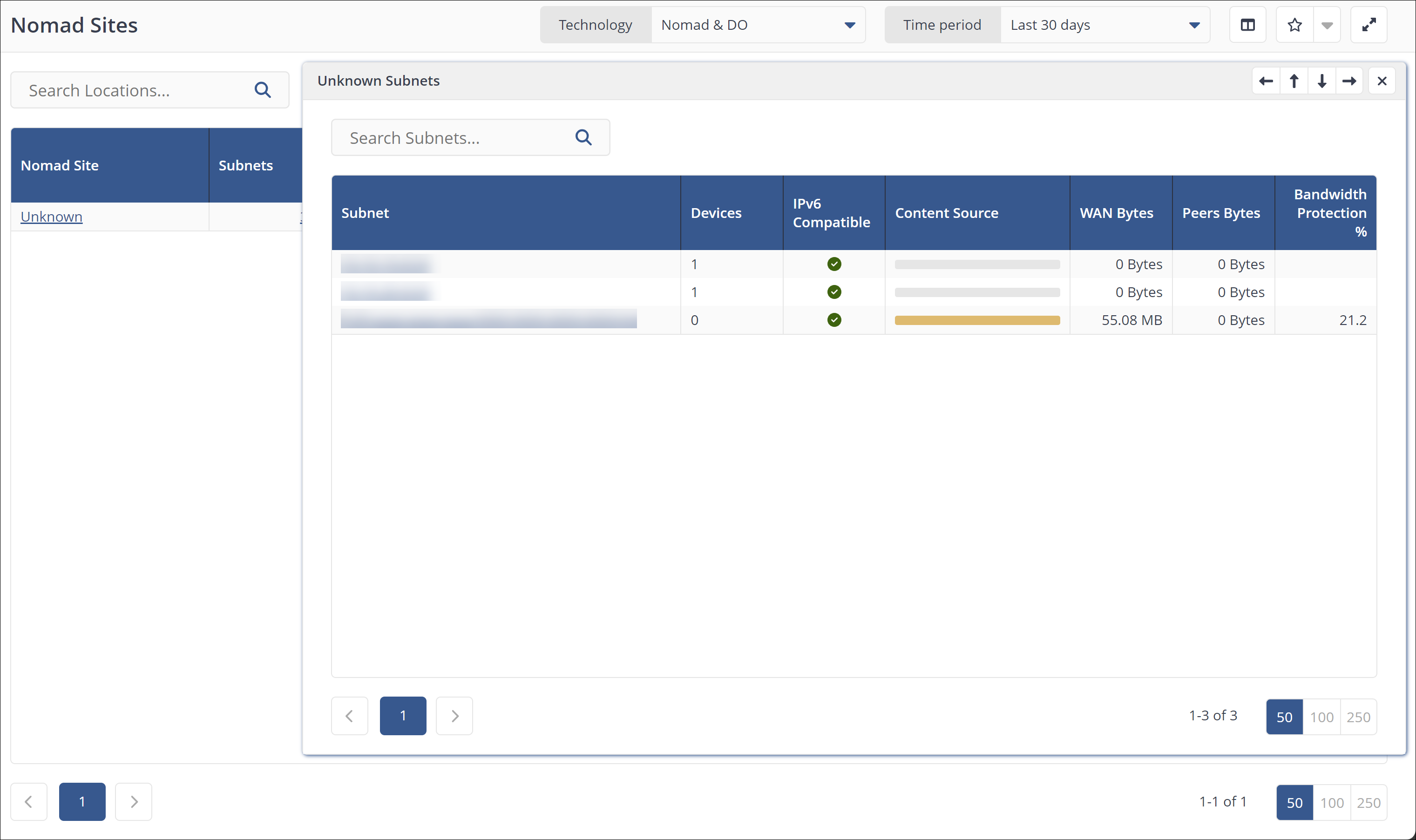 A drawer that opens up when you click on the subnets count. It shows a list of all subnets falling under that location and have downloaded the specified content, with the following functionality.