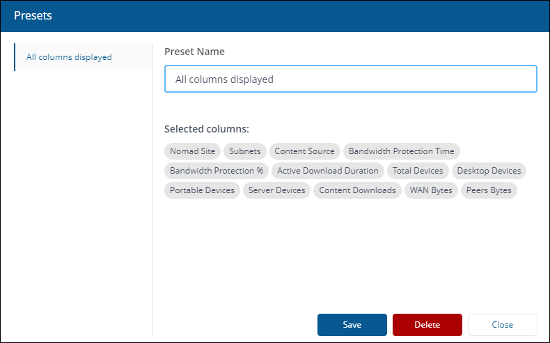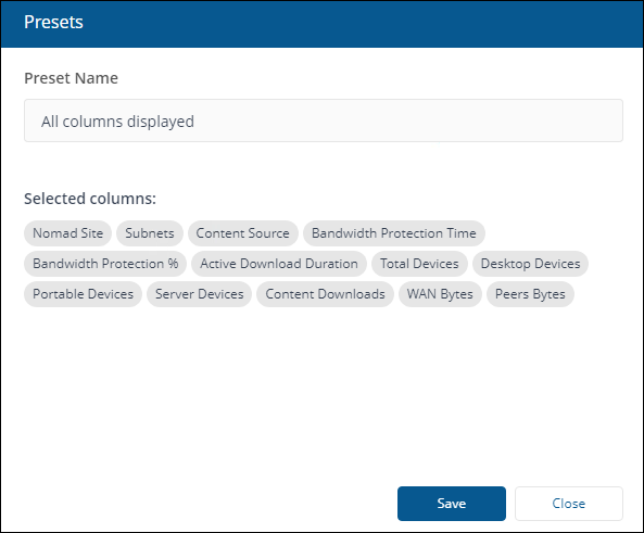 Representing the total volume of content that has been downloaded by devices in that site from peers. The number is represented in units of Bytes, KB, MB or GB as appropriate to fit in the column. This metric is not visible by default, you can select it using Select Columns. |