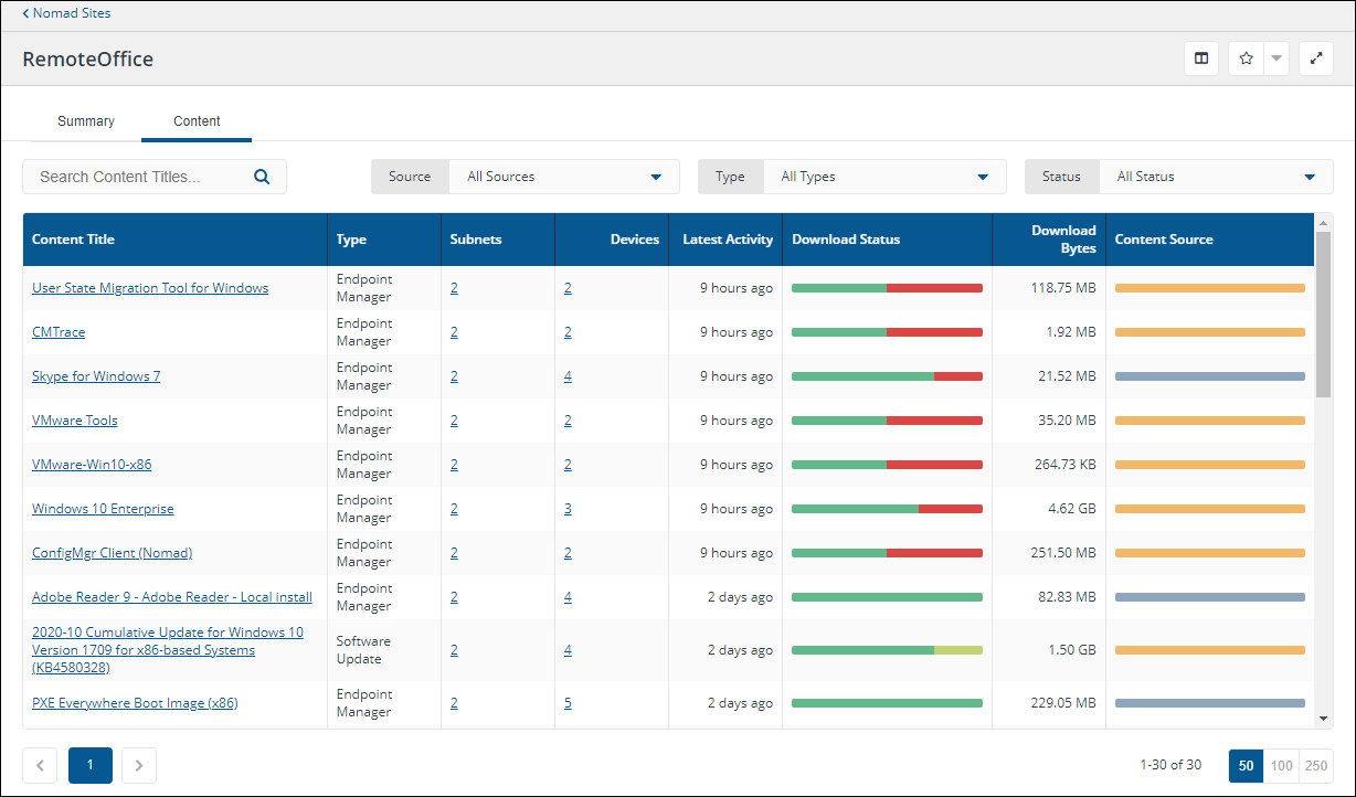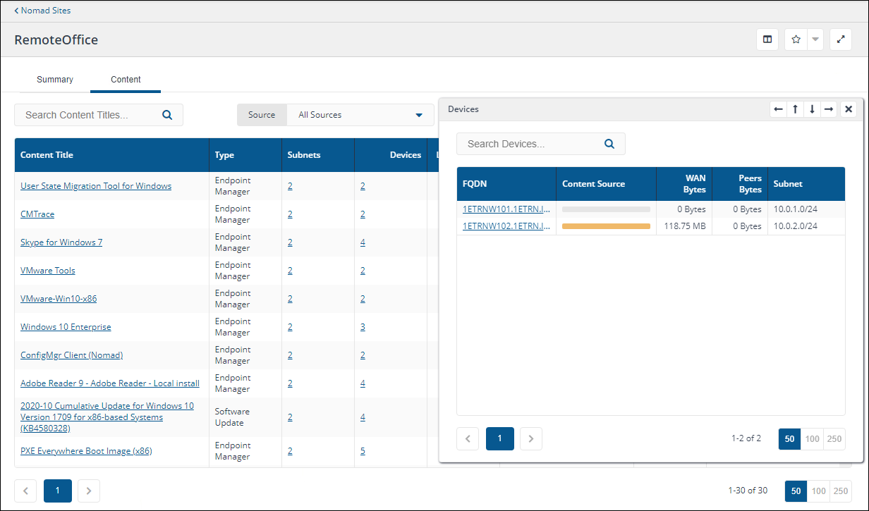 Clicking either segment in this chart will navigate to the Devices tab filtered to show the devices that downloaded the selected Content Title from Peers or WAN, according to the segment that you clicked on.