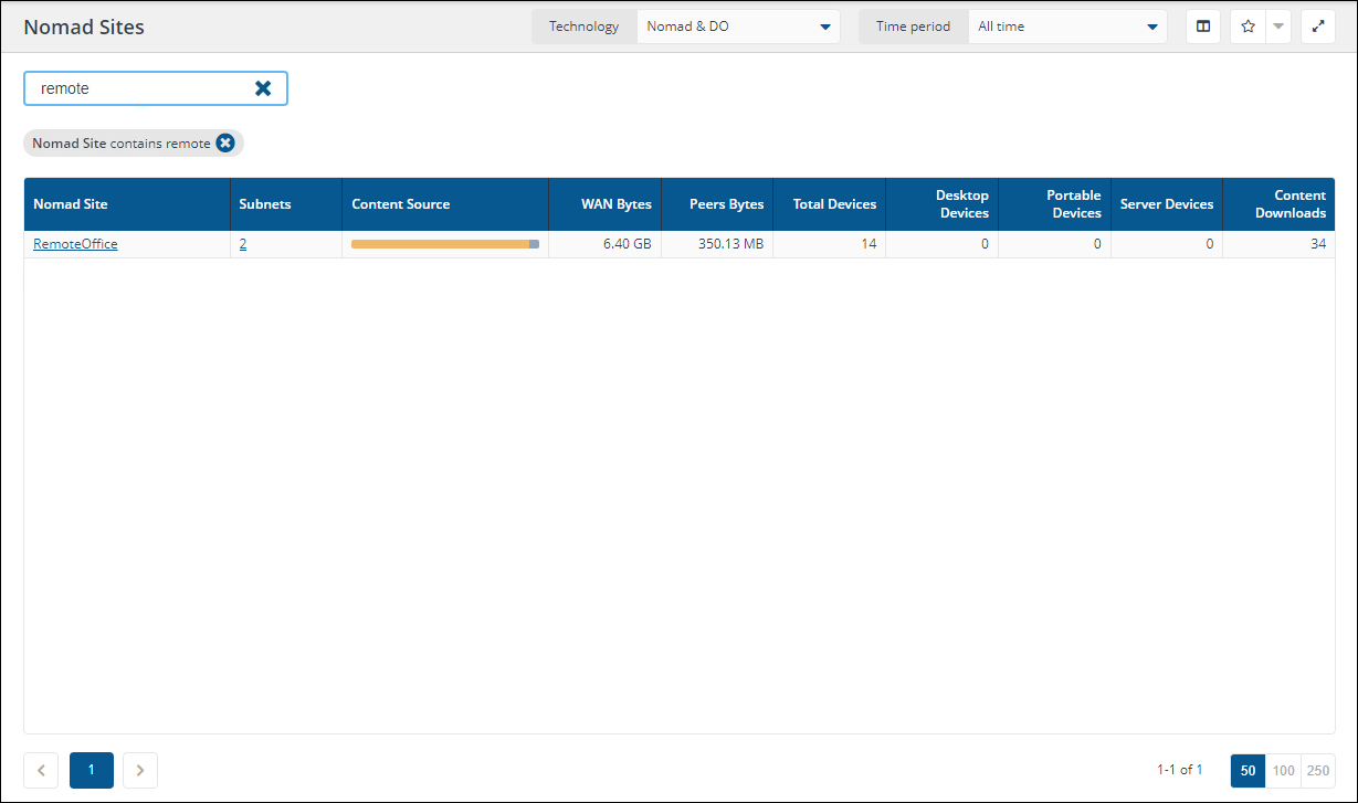 By default, the table lists Nomad Sites from which download activity has been reported within the selected Time period. These defaults can be modified using the Technology filter (to show Nomad or DO activity only) and the Time period filter.