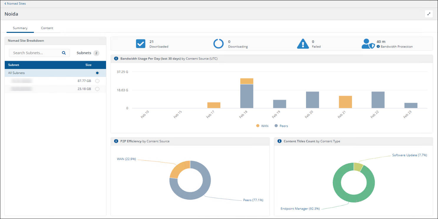 Nomad Sites page in the Nomad app shows how content distribution usage varies across network sites by tracking peer vs WAN downloads, bandwidth protection, devices, and subnets with filtering and detailed site drill-downs. Ideal for administrators monitoring content distribution efficiency and network traffic insights.