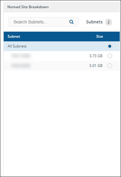 The count of subnets included in the Nomad site. Clicking on the number opens a 'drawer' that shows the peer-to-peer efficiency for each subnet in the site. Clicking on the subnet in this drawer shows the devices in that subnet reporting download activity within the selected Time period. |