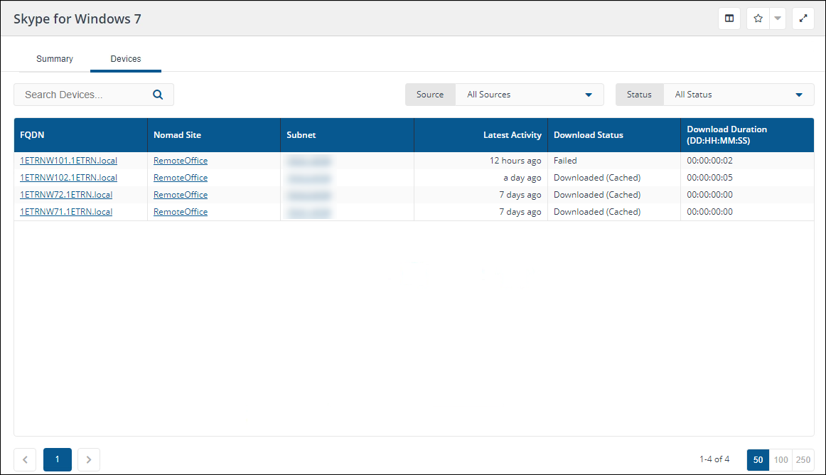 This tab is displayed when you click a Nomad Site or a segment on theDevice Count by Operating systemor P2P Efficiency by Content Source charts on the summary tab. Alternatively you can select the tab to view all devices that have reported download activity for the content title. Use theSearch Devicesbox to search for a specific device.