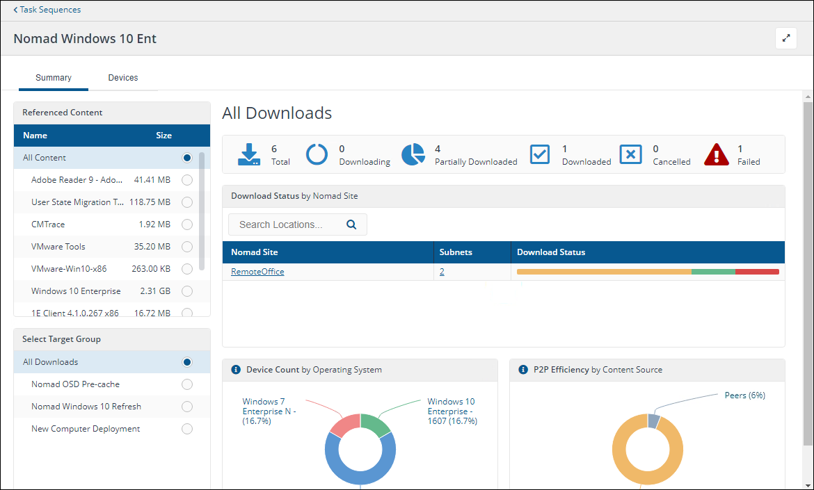 Get a clear view of Configuration Manager Task Sequences and their cached reference content with the Nomad Task Sequences page. See overall download status, activity timing, size, and filtering tools, plus deep insights on individual task sequence content distribution and device download states.