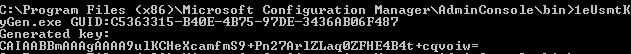 Key recovery If you need to recover the key generated by the step (perhaps your Wipe and Load Destructive or Replace Restore TS failed before restoring the user data) you can do so using the command line tool 1eUsmtKeyGen.exe. This tool is part of Installing 1E Content Distribution Tools and is installed at location <ProgramFiles>\Microsoft Configuration Manager\AdminConsole\bin\NomadBranchAdminUIExt. It can be called via the Windows Console as shown below: It takes the Configuration Manager client guid of the source machine as an argument and generates the exact key that would have been generated during the TS. To know the Configuration Manager client guid of any computer, please consult the 'SMS_Unique_Identifier0' column in the view 'dbo.v_R_System' of the config manager database. While entering the argument, please remember that: