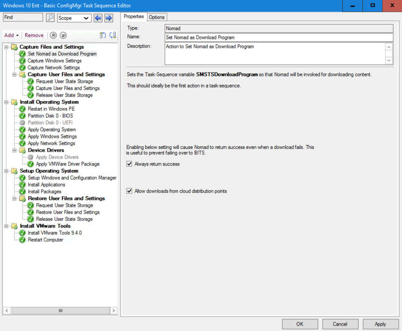 Nomad leverages the Configuration Manager SMSTSDownloadProgram task sequence variable. When this variable is set to the path to an executable, the task sequence engine calls the executable whenever it has to download some content. For this to work effectively, Nomad uses SMSTSNomad.exe.