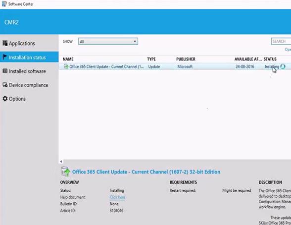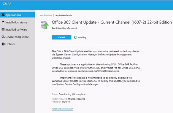 From Software Center, the Installation of the Office 365 update is initiated. During the download, its status is displayed at the bottom of the screen.