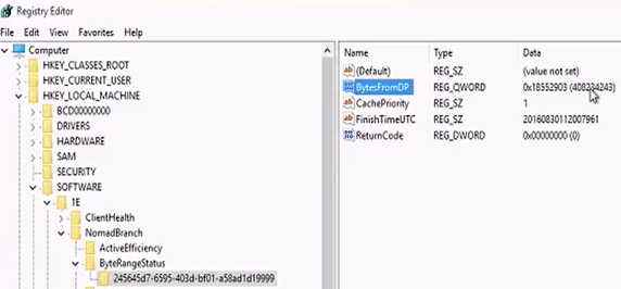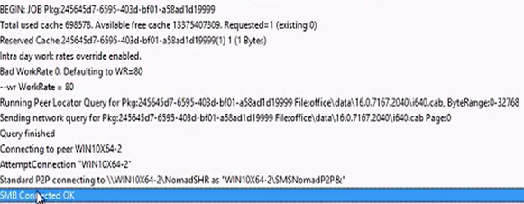 Browse to NomadBranch.log. The Standard P2P connecting to… and SMB Connected OK log entries indicates that it is initiating a download from the first Nomad client. Initially, the Nomad client registry does not display BytesFromDp as the second Nomad client is able to obtain content from the first Nomad client.