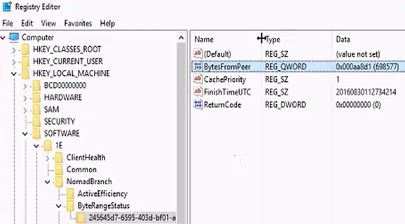 Due to differences in the state of the Office 365 installation on the second host, the CTR agent requested content that is not present on the first Nomad client. Consequently, it switches to download from the DP. Our example illustrates this event in the second Nomad client's registry.