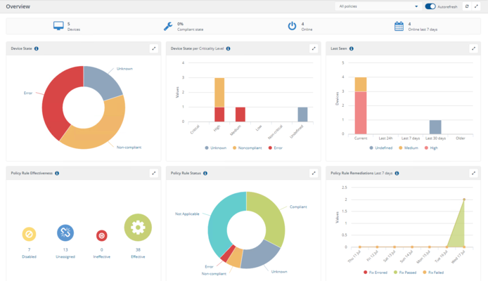 The proportion of policy rule deployments for which devices have yet to receive, evaluate or report back on their compliance position. In the example above 20% of the policy rule deployments report as Unknown because one of the five devices to which policies have been deployed has remained offline for several days. |