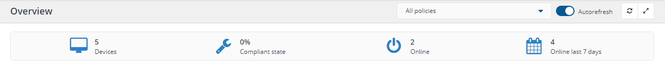 Compliance state: Percentage of devices compliant with the selected policy filter - shortcut to the Devices report filtered on State is Compliant.