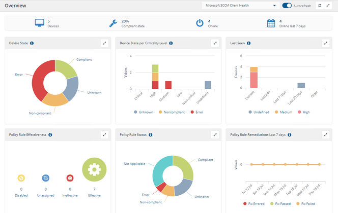 Policies drop-down list: Filter on all policies or an individual policy, for example a selection of the Microsoft SCCM Client Health policy displays a filtered overview.