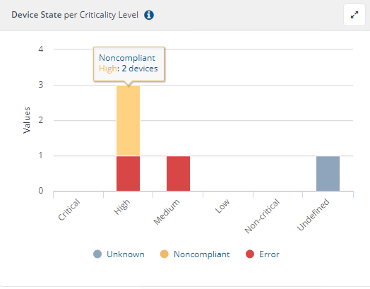 This pane presents a breakdown of the number of devices reporting against each compliance state against the device criticality groups.