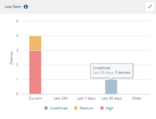 The drill down navigates to the Devices report filtered by LastSeen and criticality, such as LastSeen is Current AND Criticality is High.