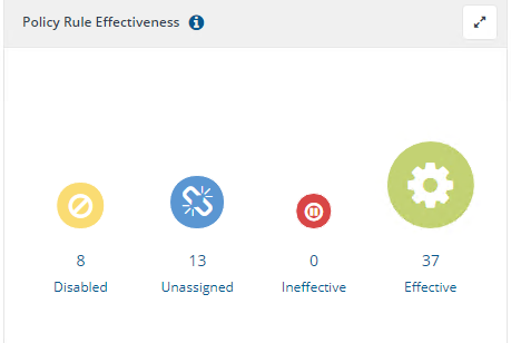 In the above example, 37 rules were deployed to a representative sample of 5 devices across the IT estate. This gives 185 policy rule deployments of which 59 rule deployments reported Compliance giving an overall Policy Rule compliance of 31.9%.