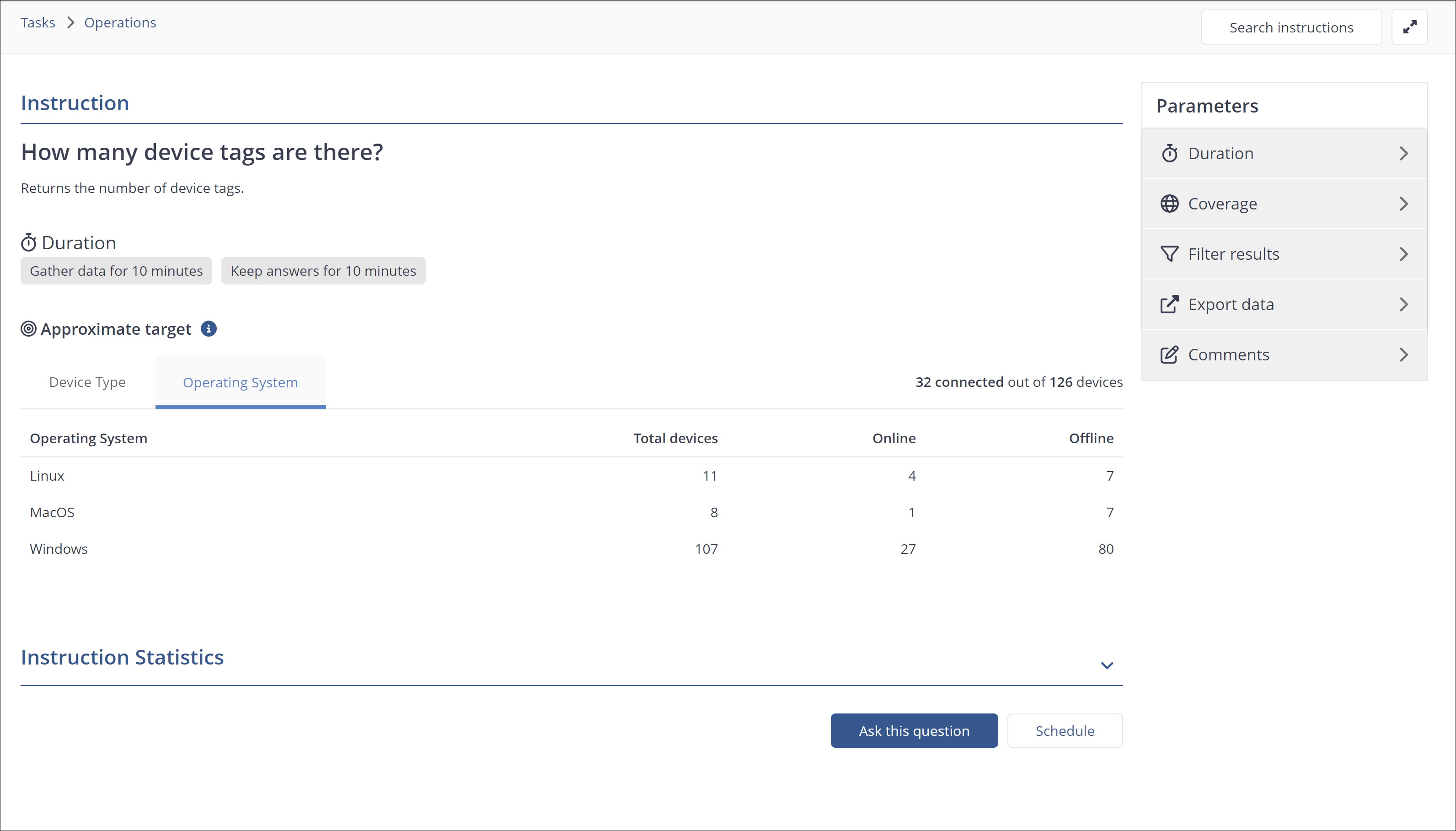 Learn how Endpoint Troubleshooting Instructions section works — view instruction history, navigate tasks, schedule instructions, and run questions or actions on endpoints.