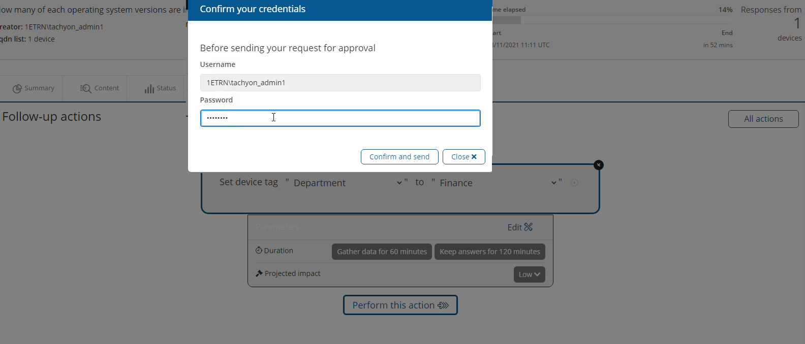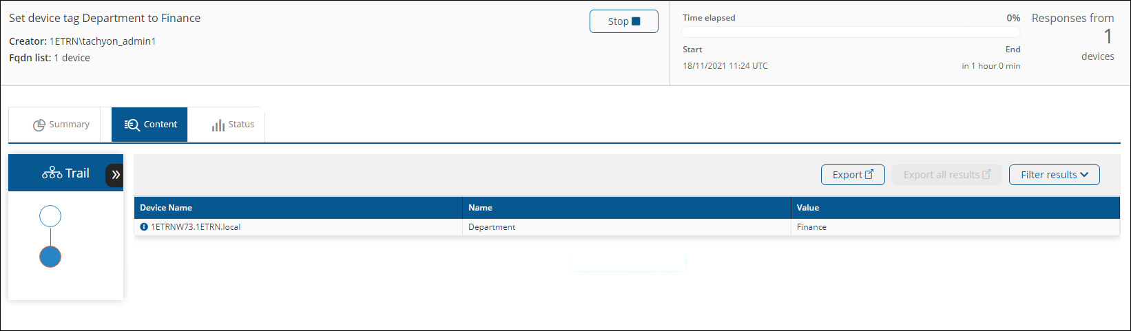 11. The action now runs and the responses appear to Tachyon_Admin 1. Here you can see the device that was targeted using their FQDN has responded and the tag with the property name Department and a value of Finance has been set.