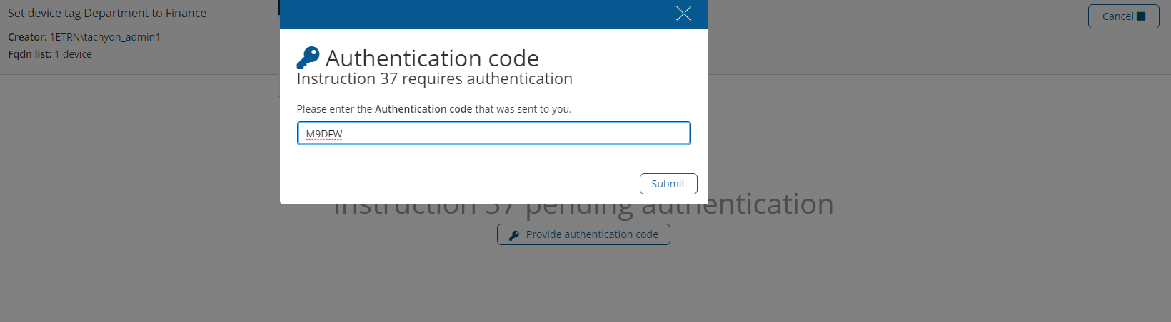 9. When challenged to provide an authentication code, Tachyon_Admin1 then checks their email, copies the code and pastes it into the challenge dialog.