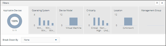 This section shows the total number of devices that have been selected for the current view and the percentage of the environment those devices comprise. If no filtering is selected, the applicable devices will be 100% of the environment and will display the total number. |