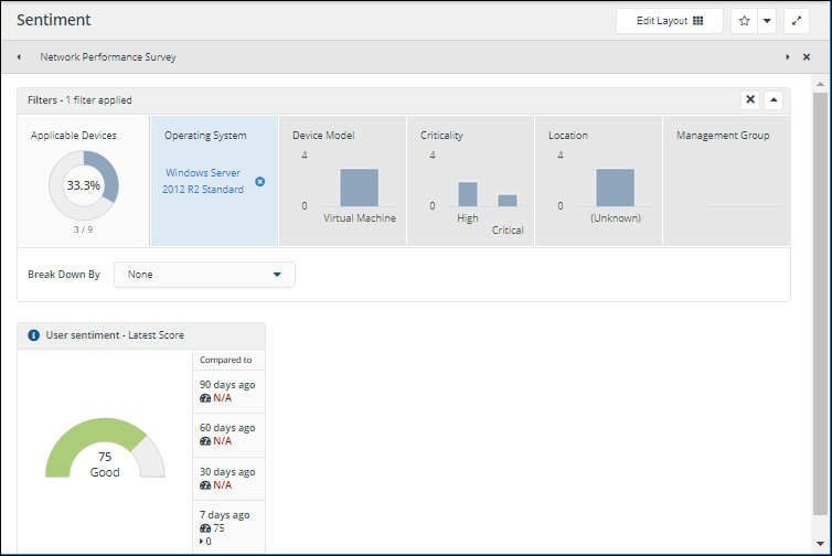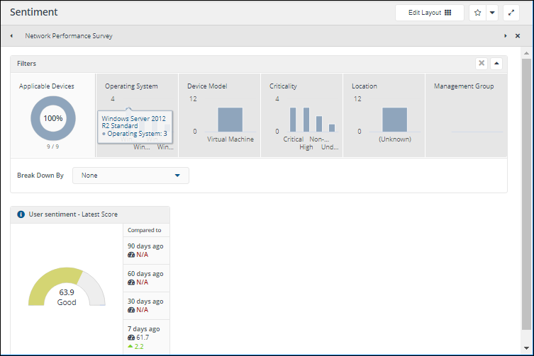 Clicking on a bar filters the data to just show those devices that have that value. For example, the picture shows the result of filtering on the Windows 2012 R2 Standard OS. The Applicable Devices section of the bar changes to show how much of the overall data is being displayed as a result of filtering, here you can see that the selected OS forms 33.3% of the overall data. The User sentiment - Latest Score chart changes to show the score for just those devices.
