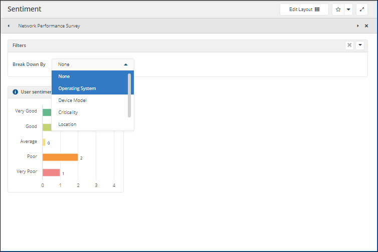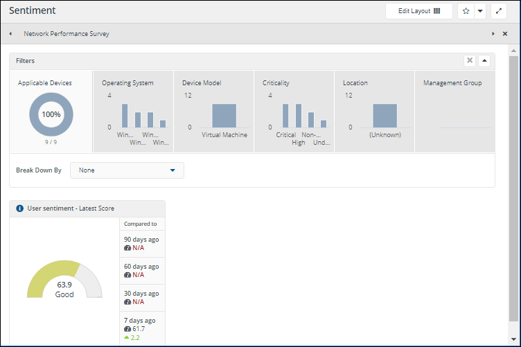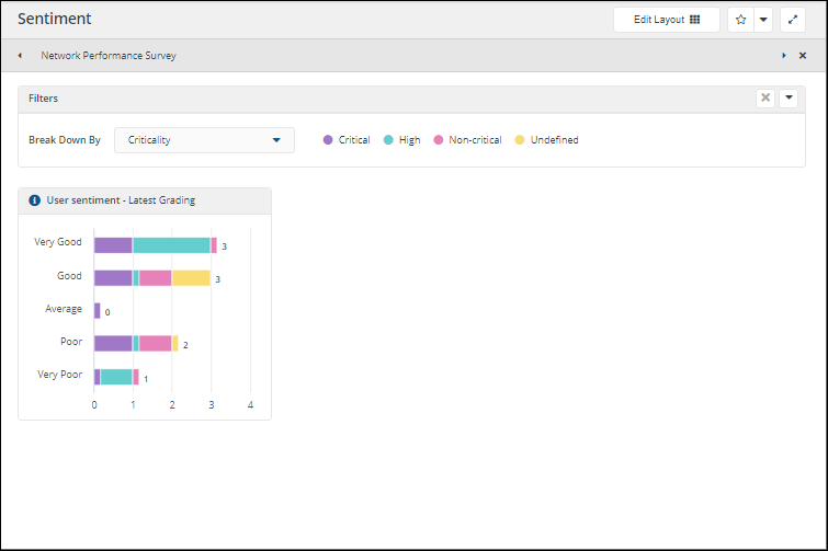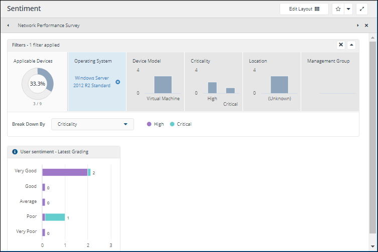 It's easy to change the parameter you break down by to see different aspects of the grading. Here the picture shows the User sentiment chart broken down by the Criticality set for the devices. Here you can see the Very Good grading consists of Critical and High devices.