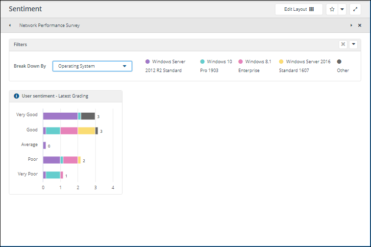 The picture shows how the individual categories for the User sentiment break down according to the Operating System. The color for each different detected type of OS is displayed in the Filters bar and can be used as a key for the information displayed in the chart.