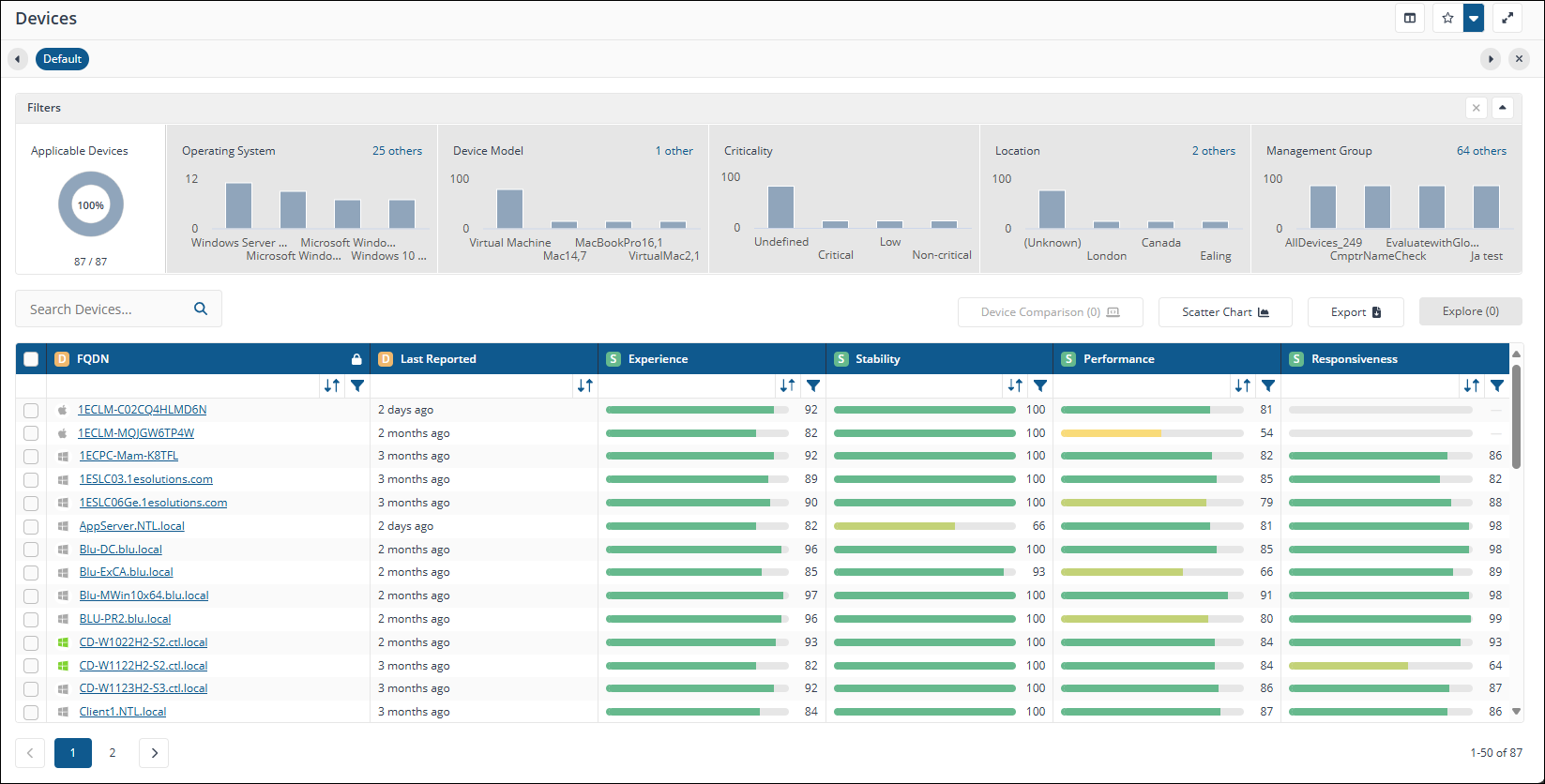 This page provides a list of all devices visible to 1E Experience Analytics. You can see Experience, Stability, Performance, and Responsiveness statistics, and you can sort them accordingly.