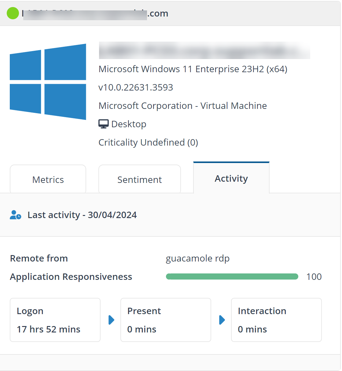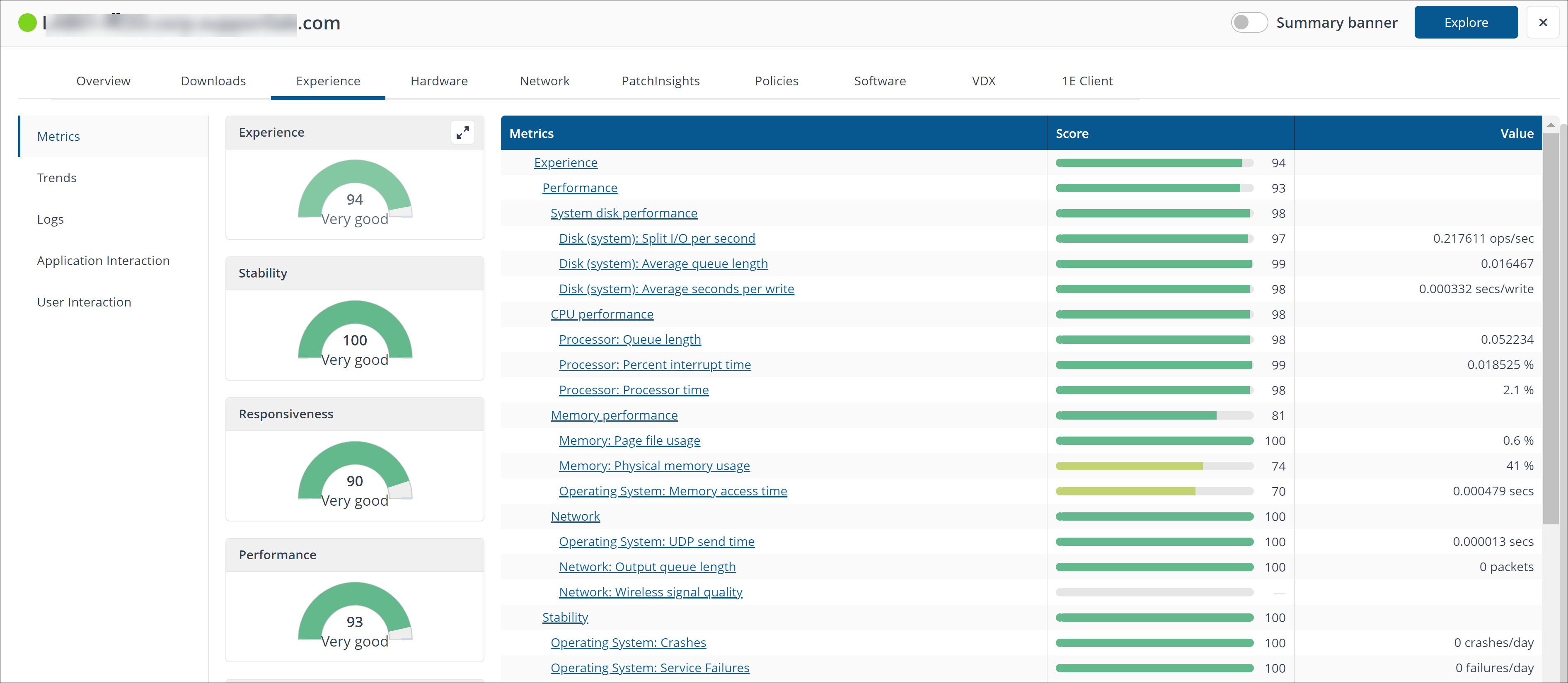 Click a link in the FQDN column in the list of devices to open the Experience tab. This tab contains information derived from and useful for 1E Experience Analytics. It contains the following panels: