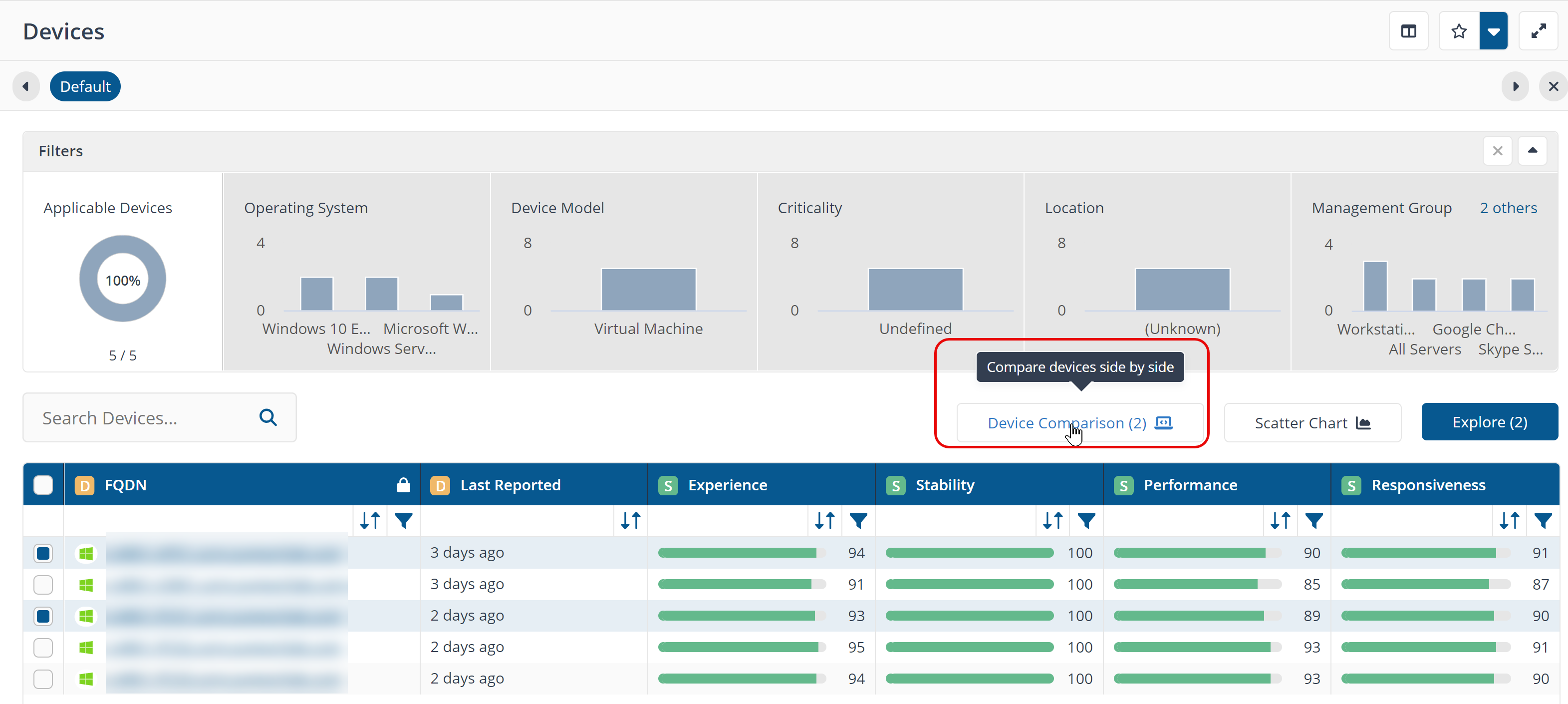 Selecting two online devices from the Devices table enables the Device Comparison button.