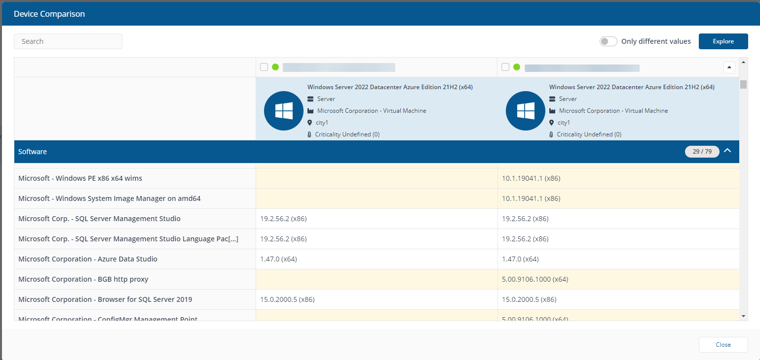 If the information displayed in the Device Comparison window is different for the devices you compare, the row is highlighted in yellow. If the information is the same, the row is highlighted in white. You can select to focus on only the differences by turning on the Only different values toggle.