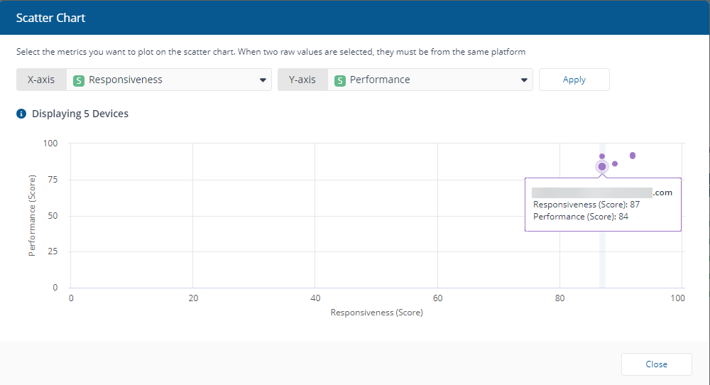 Click the Scatter Chart button on the Devices page to display the Scatter Chart window. The devices from the current view are displayed as points on a graph according to their responsiveness scores on the x-axis and performance scores on the y-axis. You can hover over a point on the graph to view its details.