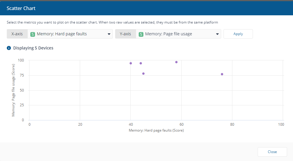 The parameters on the axes can be changed using the axis drop-down menus. The parameter you want to plot is selected from a list that can be filtered by typing text into the search field. Both axes can be changed. The screenshot below shows the device Memory: Hard page faults plotted against the Memory: Page file usage.