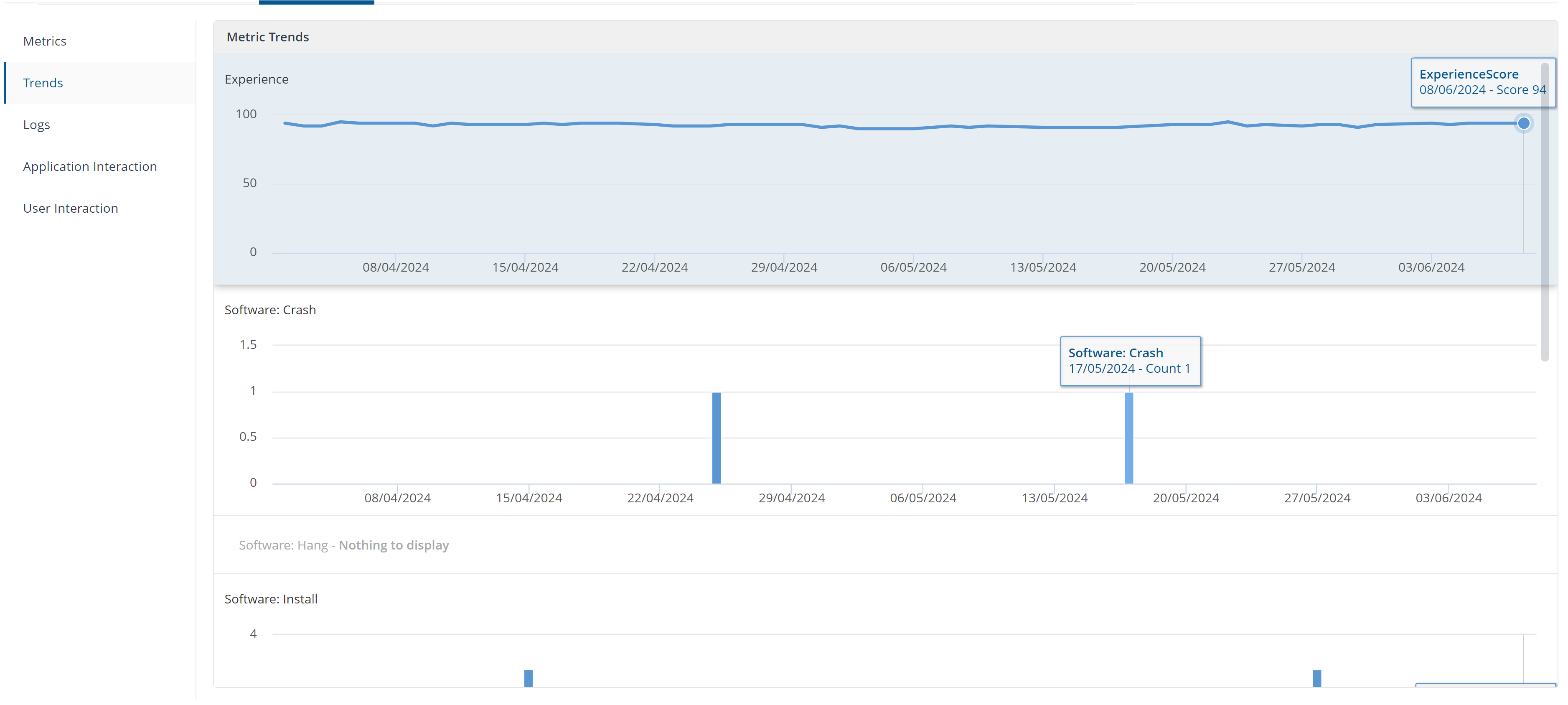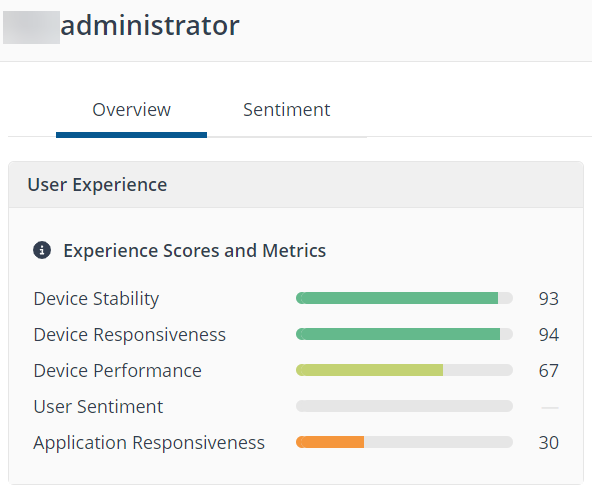 The User Experience panel on the left displays the Experience scores and metrics. These aggregated scores are derived by the Experience application from all of the devices the user is associated with and their User Sentiment Survey responses.