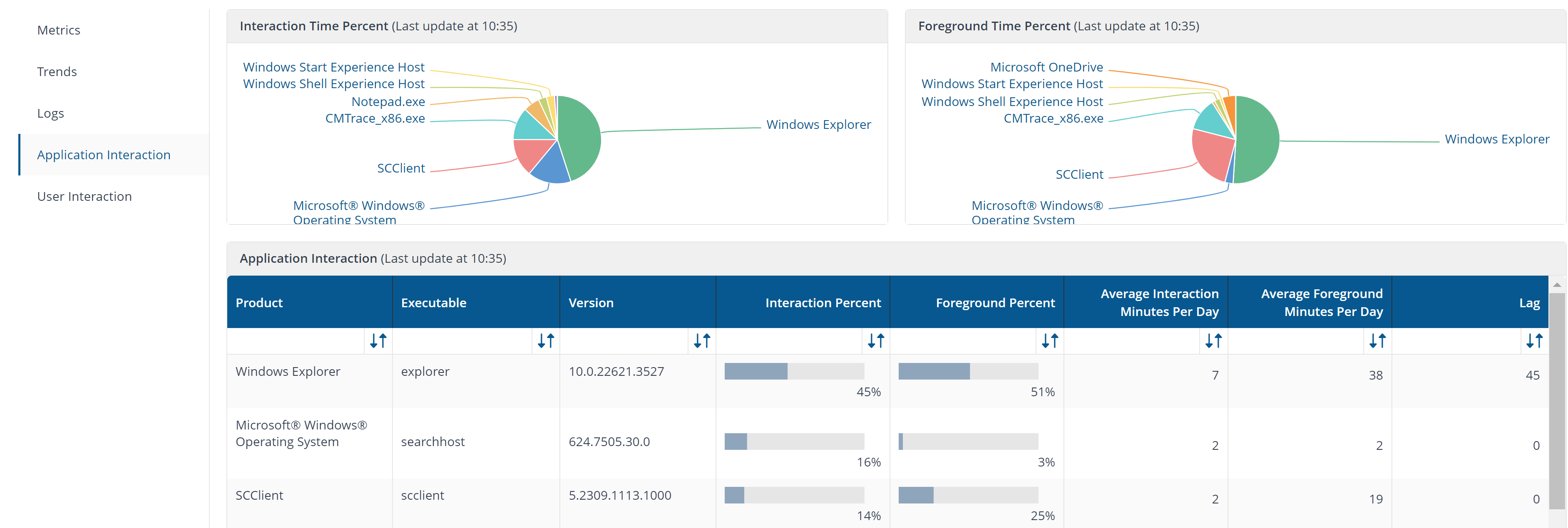 Shows two charts and lists the applications that have most recently been interacted with on the device. The Interaction Time Percent chart shows the amount of time each application on the device was interacted with as a percentage of the time for all the applications. The Foreground Time Percent chart shows the amount of time each application spent in the foreground as a percentage of the time for all the applications. The applications that have been most recently interacted with on the device are displayed in a list and can be sorted by the following columns: