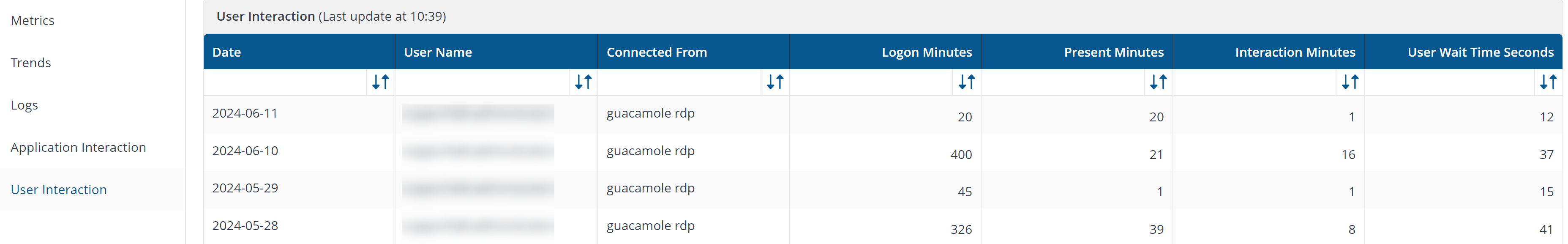 Shows a list of information about the last known user for the device. This can be sorted by the following columns.