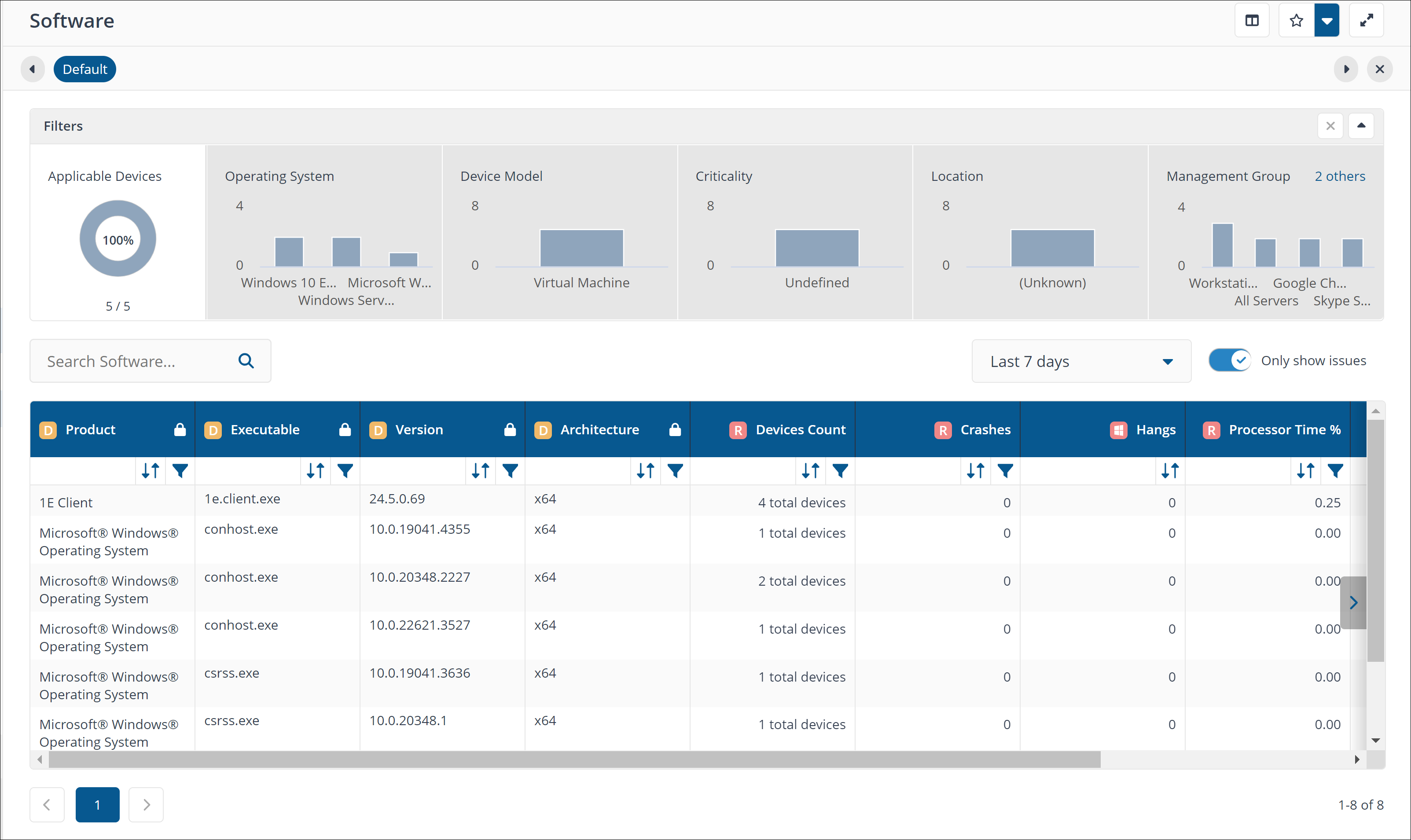 The Software page provides a tabular listing of all the software products that are installed in the environment (including executable, version, and architecture). The second set of columns in the list provide additional metrics or event details associated with the software products.