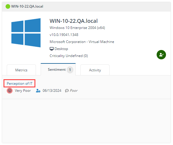 The number of entries where the latest User Sentiment score is marked as poor (orange) or very poor (red with an exclamation point). The number is a link that you can click to see the user's Sentiment Survey responses, filtered to show the latest and just poor or very poor ratings. |
